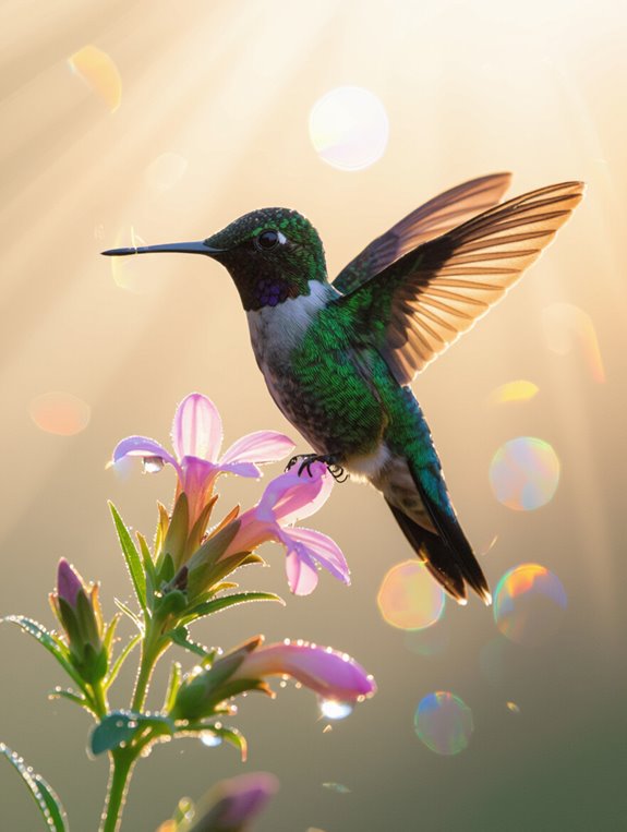 When you witness their iridescent dance, you’re experiencing divine guidance flowing through air’s sacred currents. Their rapid wingbeats create vibrational frequencies that open channels between dimensions, allowing nature spirits to communicate directly with your consciousness. Through this air element mastery, hummingbirds become living conduits for spiritual insight and liberation.